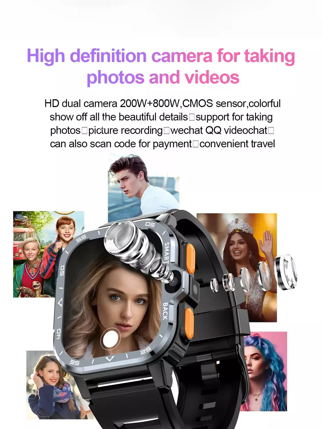 Tamanho da tela principal: tela quadrada HD de 2,03 polegadas